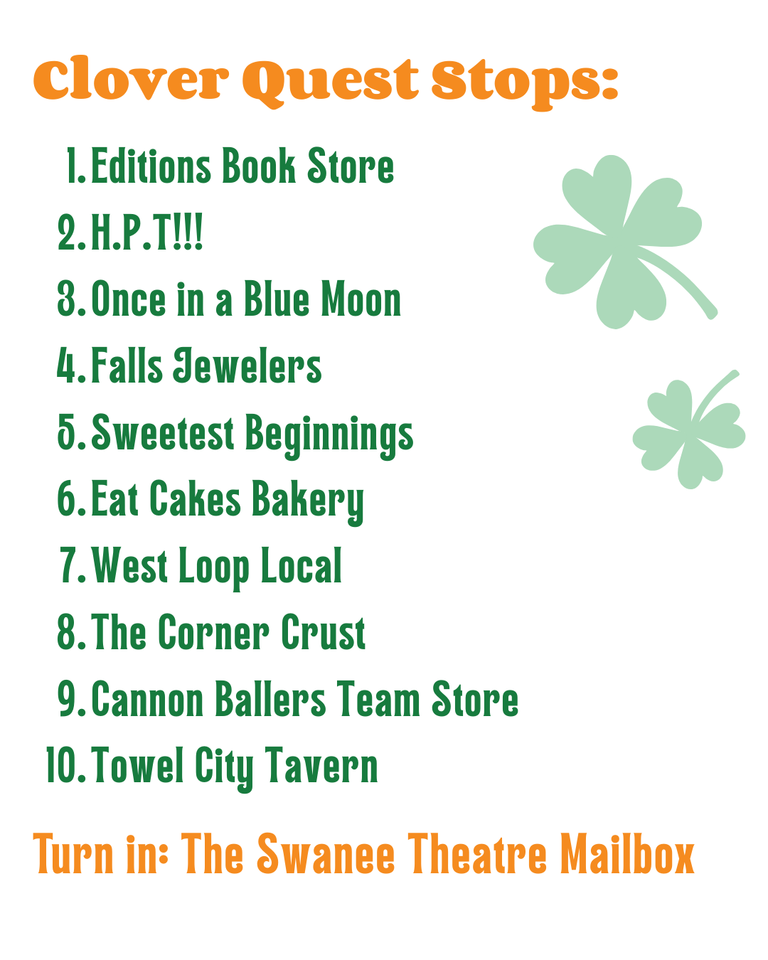 Pick up a scavenger sheet at any participating business below to complete the Clover Quest. Find the 4-leaf clover at all 10 businesses. Once found, have an employee stamp your scavenger sheet. After collecting all stamps, turn your completed sheet into the Swanee Theatre mailbox (200 West Avenue) for a chance to win a prize!